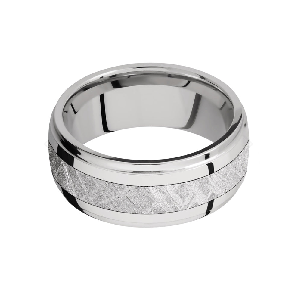 Specs: Classic domed men's band with stepped edges and meteorite inlay.